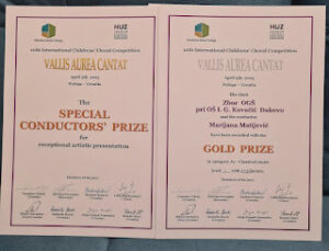 Na X. međunarodnom natjecanju VALLIS AUREA CANTAT, koje je održano u subotu u Požegi, Zbor Osnovne glazbene škole pri OŠ “Ivan Goran Kovačić” natjecao se u kategoriji klasična glazba i svojim nastupom u jakoj konkurenciji zaslužio zlatnu nagradu, a dirigentica i voditeljica zbora Marijana Matijević je dobila posebnu nagradu za umjetnički dojam i rad sa zborom.