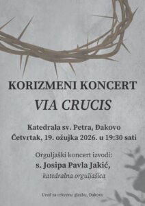 U katedrali sv. Petra u Đakovu u četvrtak, 19. ožujka održat će se orguljaški koncert pod nazivom „Via crucis“ s početkom u 19.30 sati. Koncert će izvesti s. Josipa Pavla Jakić, katedralna orguljašica. Na programu su djela Bacha i Mendelssohna, a glavni dio koncerta bit će improvizacije s. Josipe Pavle na teme postaja križnoga puta.
